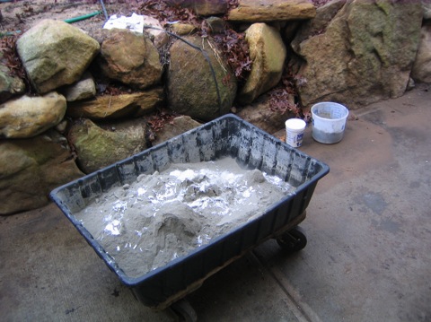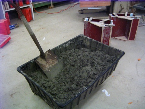 The wetter the concrete mix the weaker the end product will be. It is a common beginners mistake is to add too much water. You should be shooting for a dry mix the consistency of oatmeal. The mixture pictured below will trowel to a smooth wet look. This is a good way to get a feel for the mix. Ready to fill the form!